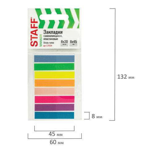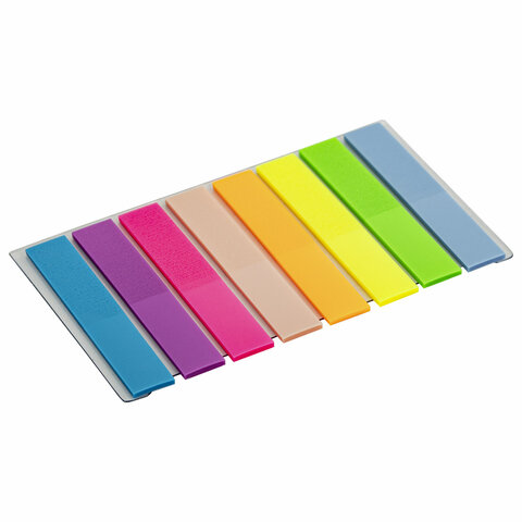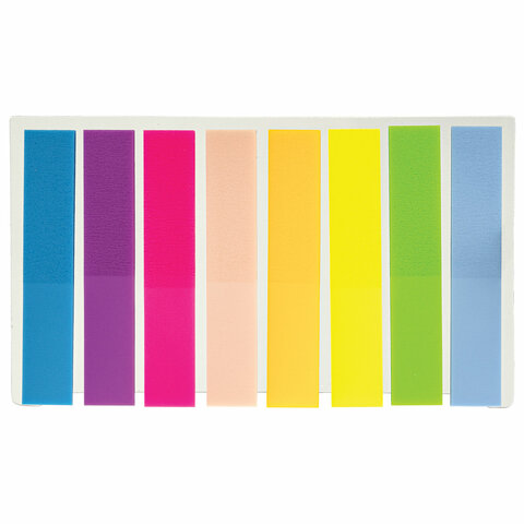 Набор пластиковых закладок 8 неоновых цветов размером 45х8 мм состоит из 160 листов, по 20 закладок каждого цвета. Клейкий слой - 22 Н/м. Легко клеятся к любой поверхности и не оставляют следов. Материал закладок позволяет делать надписи ручкой и карандашом. Уложены на пластиковом основании. Поставляются в полиэтиленовом пакете с европодвесом.