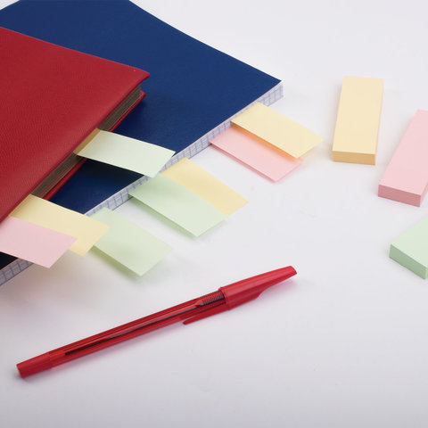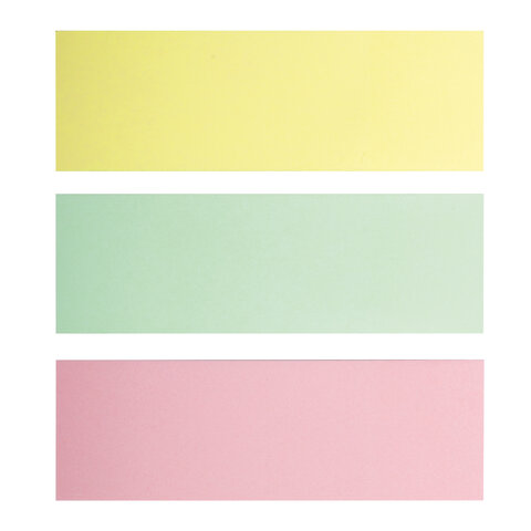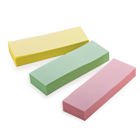 Набор бумажных закладок 3 пастельных цветов размером 76х25 мм состоит из 300 листов, по 100 закладок каждого цвета. Клейкий слой - 22 Н/м. Легко клеятся к любой поверхности и не оставляют следов. Материал закладок позволяет делать надписи ручкой и карандашом. Поставляются в полиэтиленовом пакете с европодвесом.