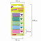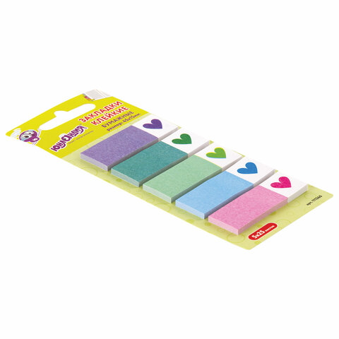В наборе по 25 закладок каждого из 5 цветов. Размер закладки: 45х15 мм. Клейкий слой - 32 Н/м. Материал закладок позволяет делать на них надписи ручкой или карандашом. Поставляются в полиэтиленовом пакете с европодвесом.