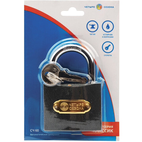 Замок навесной, ширина 60 мм, чугун, дужка d-8,4 мм, английский, 3 ключа, ЧЕТЫРЕ СЕЗОНА, в блистере, 79-0006