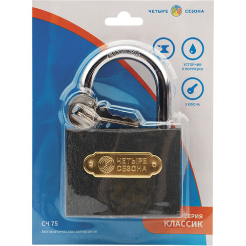 Замок навесной, ширина 75 мм, чугун, дужка d-9,5 мм, английский, 3 ключа, ЧЕТЫРЕ СЕЗОНА, в блистере, 79-0007