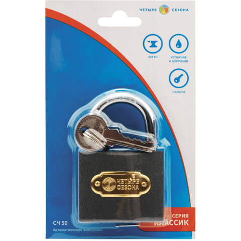 Замок навесной, ширина 50 мм, чугун, дужка d-7,4 мм, английский, 3 ключа, ЧЕТЫРЕ СЕЗОНА, в блистере, 79-0005