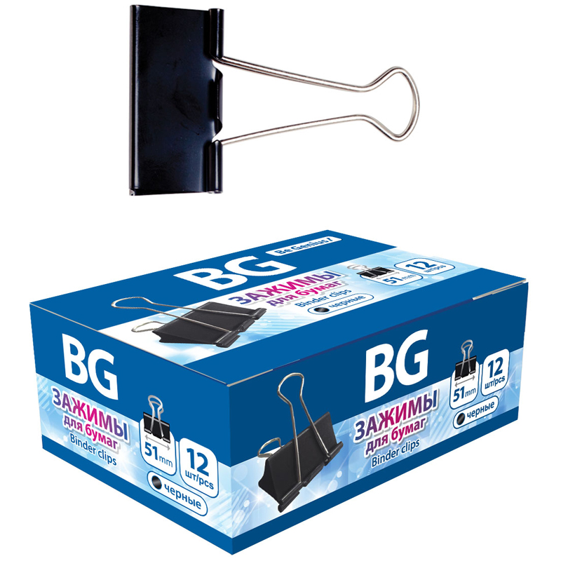 Зажим для бумаг BG предназначен для скрепления бумажных носителей, выполнен из металла, надежно и легко скрепляет, не деформирует бумагу и не оставляет следов. В картонной коробке 12 зажимов размером 51 мм. Цвет: чёрный.<br/>• количество в упаковке: 12;<br/>• ширина зажима: 51 мм;<br/>• цвет: чёрный.