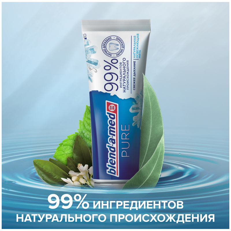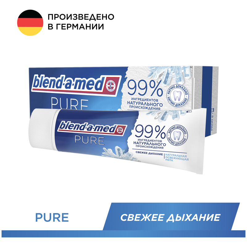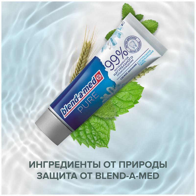 Blend-a-med представляет свою первую линейку зубных паст, состоящую на 99% из ингредиентов натурального происхождения – Pure. Зубная паста Blend-a-med Pure Свежее дыхание включает в себя только самое необходимое без компромиссов по вкусу и эффективности. Паста защищает от кариеса и дарит усиленное ощущение свежести на весь день при использовании два раза в сутки. В пасте отсутствуют SLS, диоксид титана и искусственные красители и добавки, кроме того картонная пачка подлежит вторичной переработке при наличии доступной инфраструктуры. Паста обладает прозрачной гелевой текстурой и вкусом освежающей натуральной мяты. Объем 75 мл. Произведено в Германии. Срок годности 24 месяца с даты изготовления, указанной на упаковке.