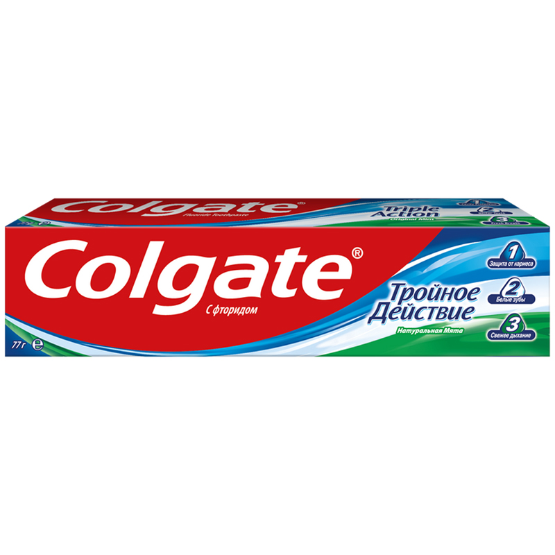 Зубная паста Colgate "Тройное действие" обеспечивает максимальную защиту от кариеса. Эта трехцветная зубная паста оказывает тройное действие: помогает защищать зубы от кариеса, помогает удалять потемнения с поверхности зубов и освежает дыхание. Что немаловажно, Colgate "Тройное действие" обладает приятным мятным вкусом!