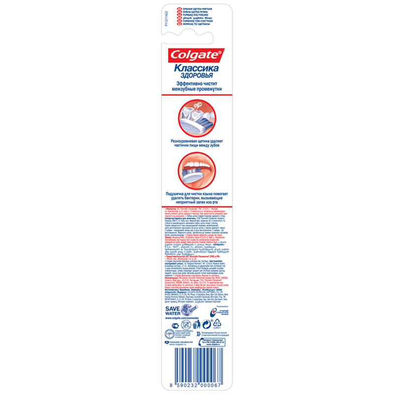 Усовершенствованная двухкомпонентная зубная щетка Зубная щетка Colgate "Классика Плюс" с щетинками V-образной формы глубоко и бережно очищает межзубные промежутки, а подушечка для чистки языка помогает удалять бактерии, вызывающие неприятный запах изо рта. Мягкая щетка.