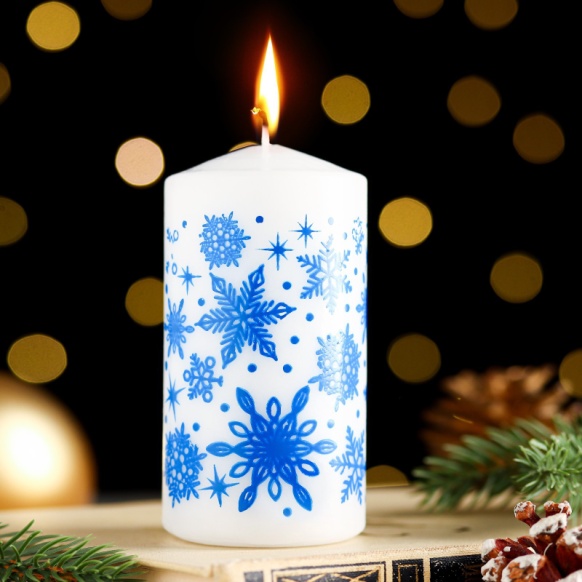 Новый год. Свеча - цилиндр новогодняя "Снежинки", 5х10 см, белая с синим
