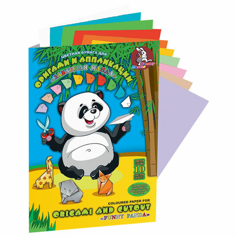 Цветная бумага А4 для аппликаций и оригами, 10 л., 10 цв., 80 г/м2, в папке, "Панда", 210х297 мм, ПО-9180