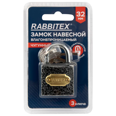 Замок навесной чугунный "Влагонепроницаемый", ширина 32 мм, полимерное покрытие, английский, 3 ключа, RABBITEX (РАББИТЕКС), 671295