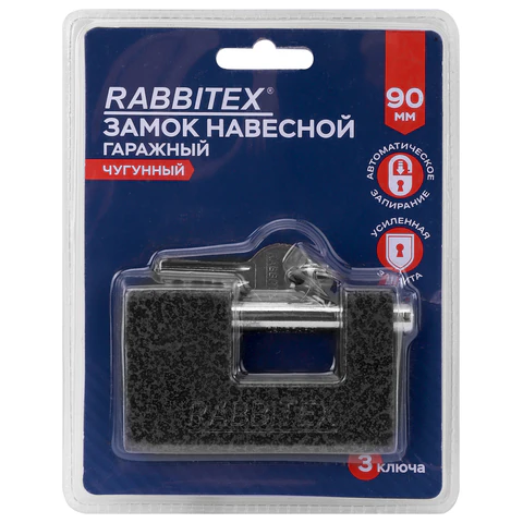 Замок навесной чугунный 90 мм "Гаражный" с полимерным покрытием, 3 ключа, RABBITEX (РАББИТЕКС), 671303