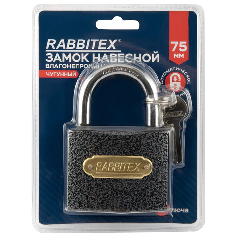 Замок навесной чугунный "Влагонепроницаемый", ширина 75 мм, полимерное покрытие, английский, 3 ключа, RABBITEX (РАББИТЕКС), 671299
