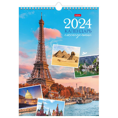 Календарь на гребне с ригелем на 2024 г., 24х32 см, Еженедельник 56 л., "Вокруг света", HATBER, 56Кнп4гр_29920