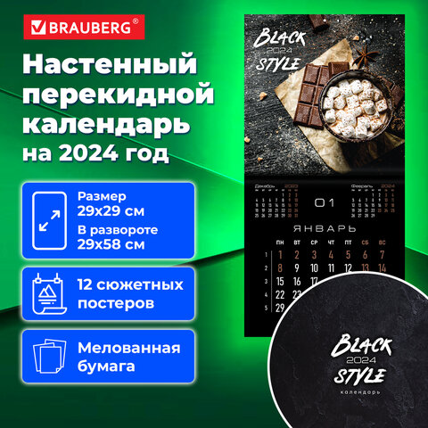 Календарь настенный перекидной на 2024 г., BRAUBERG, 12 листов, 29х29 см, "Black Style", 115314