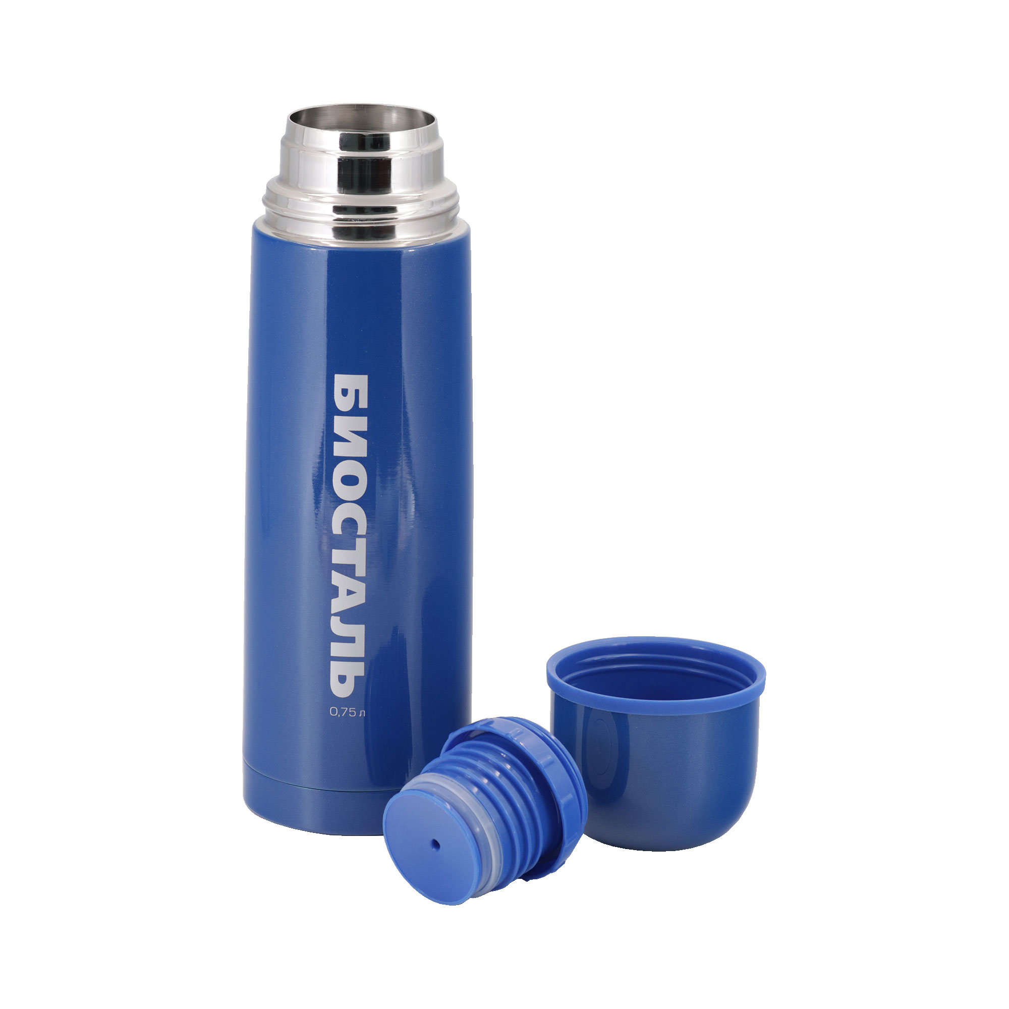 Термос "Биосталь" с узкой горловиной и пробкой с кнопкой, цв.синий, 0,75 л/12/