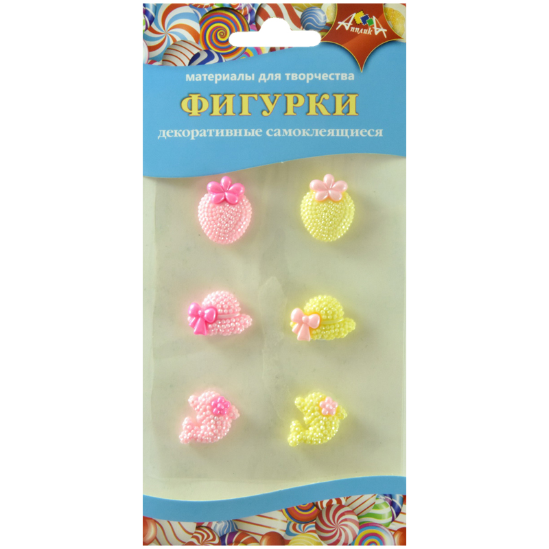 Материал декоративный Апплика "Фигурки самоклеящиеся", ассорти (клубничка, шляпка, дельфинчик), 6шт.