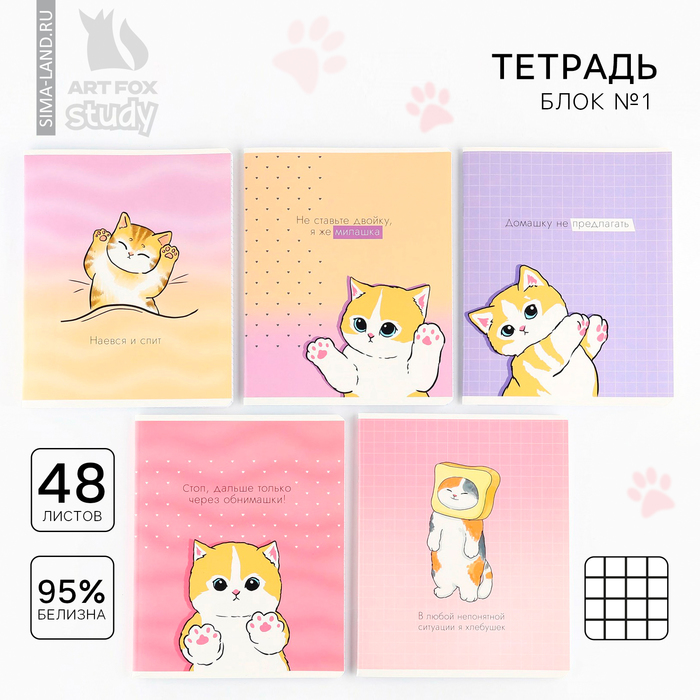 Тетрадь в клетку, 48 листов А5 на скрепке , внутренний блок №1 МИКС «1 сентября: Котик с лапками» твин лак, уф лак