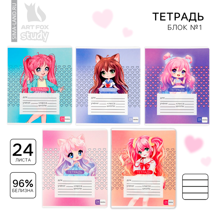 Тетрадь в линейку 24 листа А5, на скрепке «1 сентября: Аниме», обложка мелованный картон, 5 видов МИКС