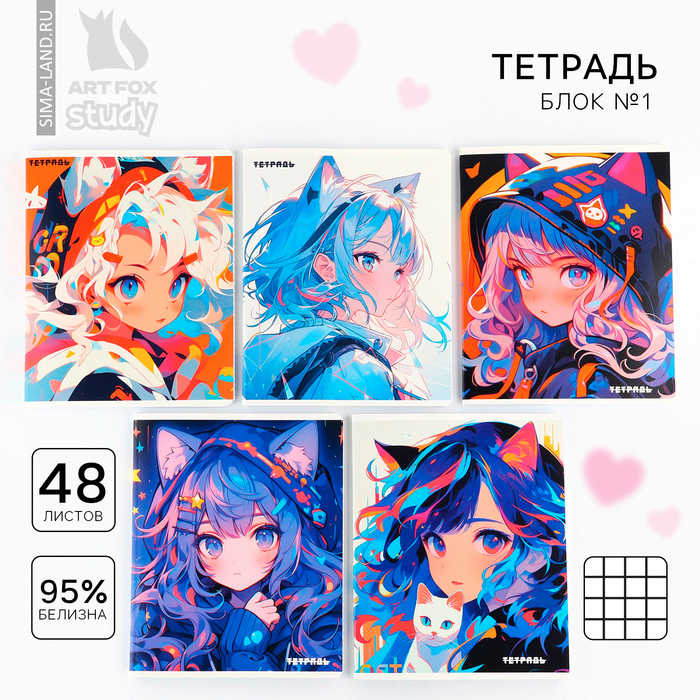 Тетрадь в клетку, 48 листов А5 на скрепке , внутренний блок №1 МИКС «1 сентября: Аниме. Девочка кошка» твин лак, уф лак