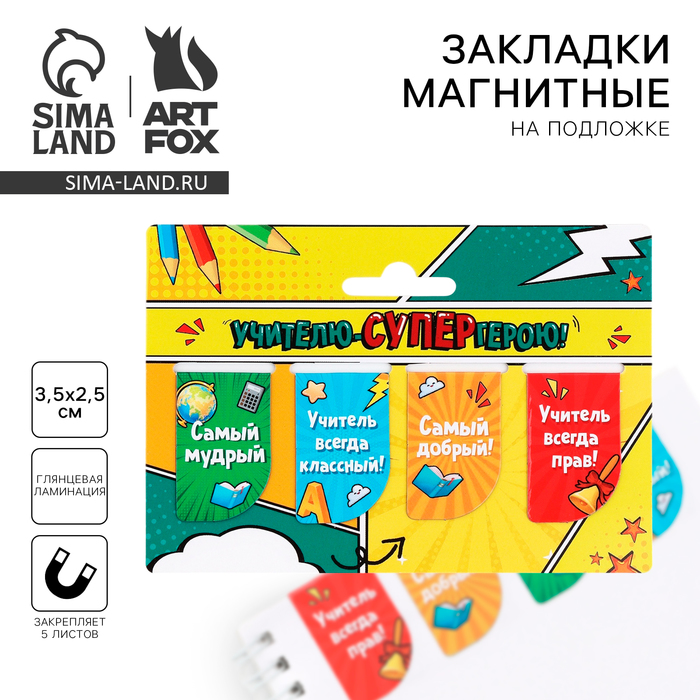 Набор магнитных закладок 4 штуки на подложке «Учителю-СУПЕРгерою!»