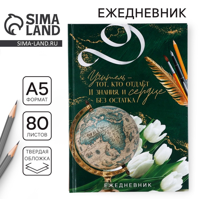 Ежедневник А5, 80 л, твердая обложка «Учителю: Золотой глобус с пером»