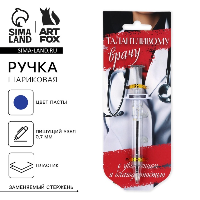 Ручка прикол шариковая синяя паста, шприц «Талантливому врачу», на подложке