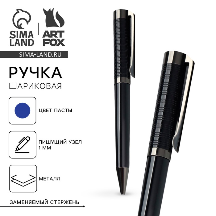 Ручка шариковая синяя паста 0.1 мм, металл рифлёная черный корпус