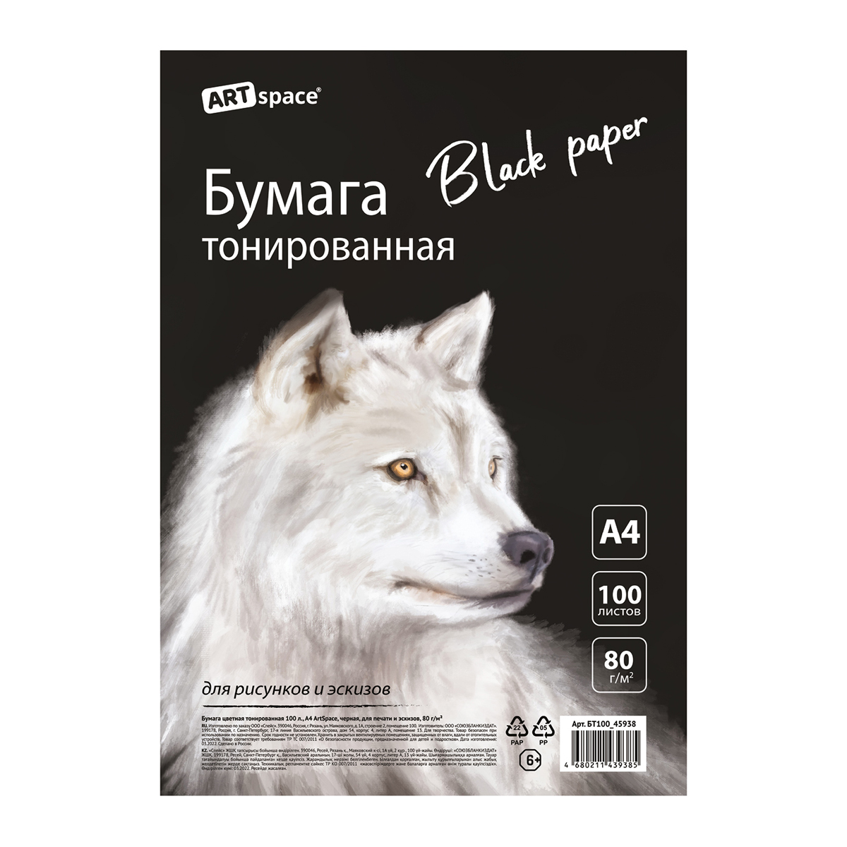 Бумага цветная тонированная, 100л., А4 ArtSpace, черная, для печати и эскизов, 80г/м2