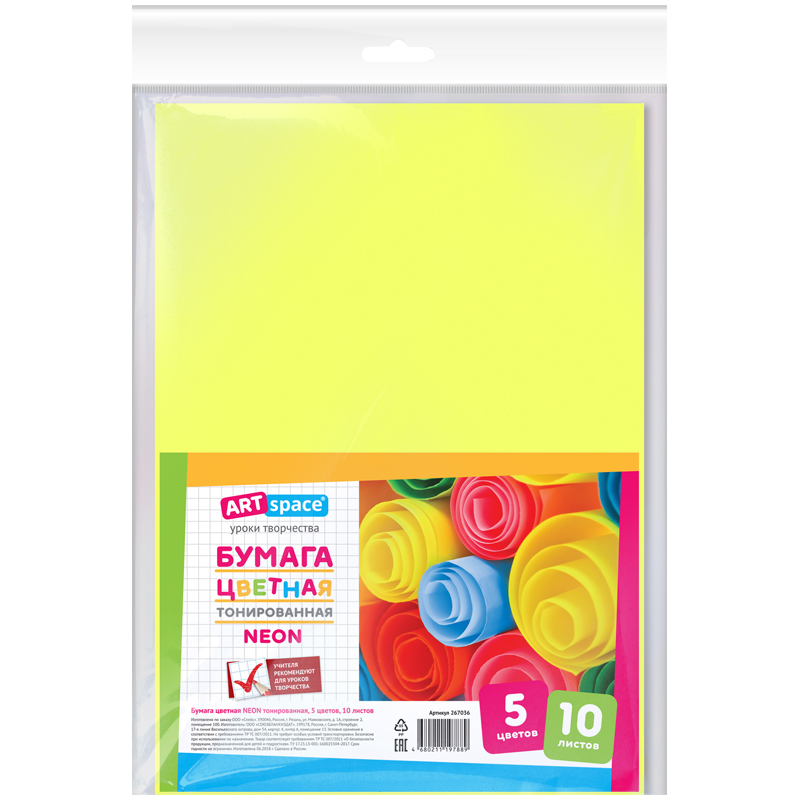 Цветная бумага A4, ArtSpace, 10л., 5цв., тонированная, неоновая, в пакете с европодввесом