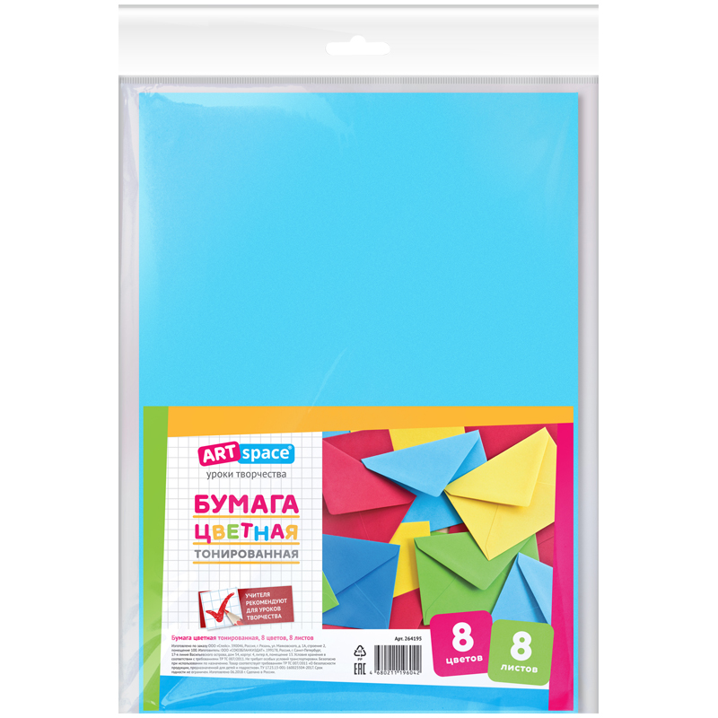 Цветная бумага тонированная А4, ArtSpace, 8л., 8цв., в пакете