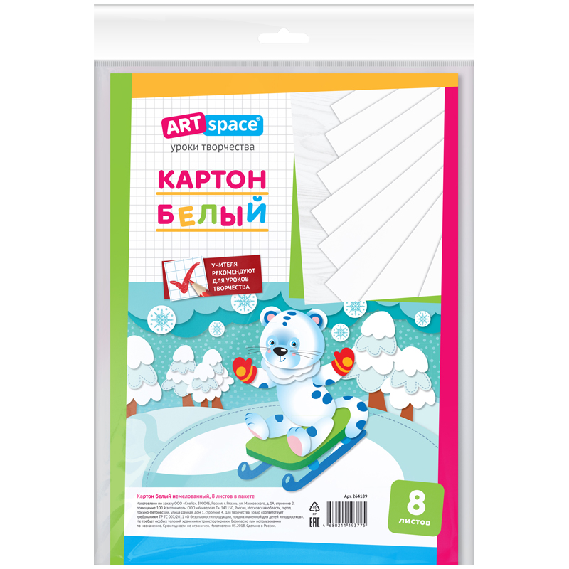 Картон белый A4, ArtSpace, 8л., немелованный, в пакете с европодвесом