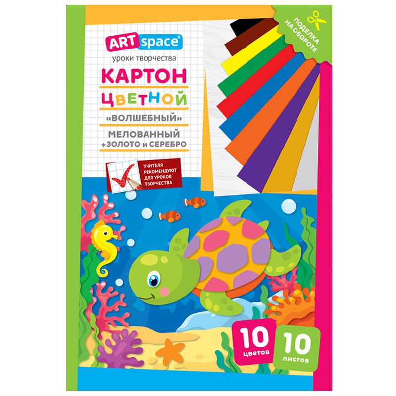 Картон цветной А4, ArtSpace, 10л., 10цв., мелованный, золото, серебро, в папке, "Волшебный. Черепашка"