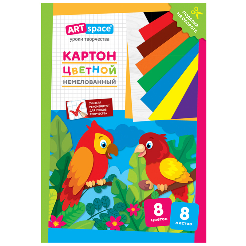 Картон цветной А4, ArtSpace, 8л., 8цв., немелованный, в папке, "Попугай"
