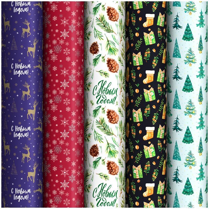 Упаковочная бумага глянц. 70*100см, ArtSpace "Зимний лес", 90г/м2, ассорти 5 дизайнов