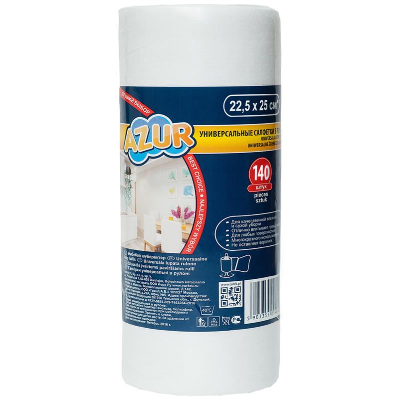 Салфетки для уборки York "Azur", вискоза/полиэфир, 22,5*25см, 140шт, в рулоне, 35г/м2, белые