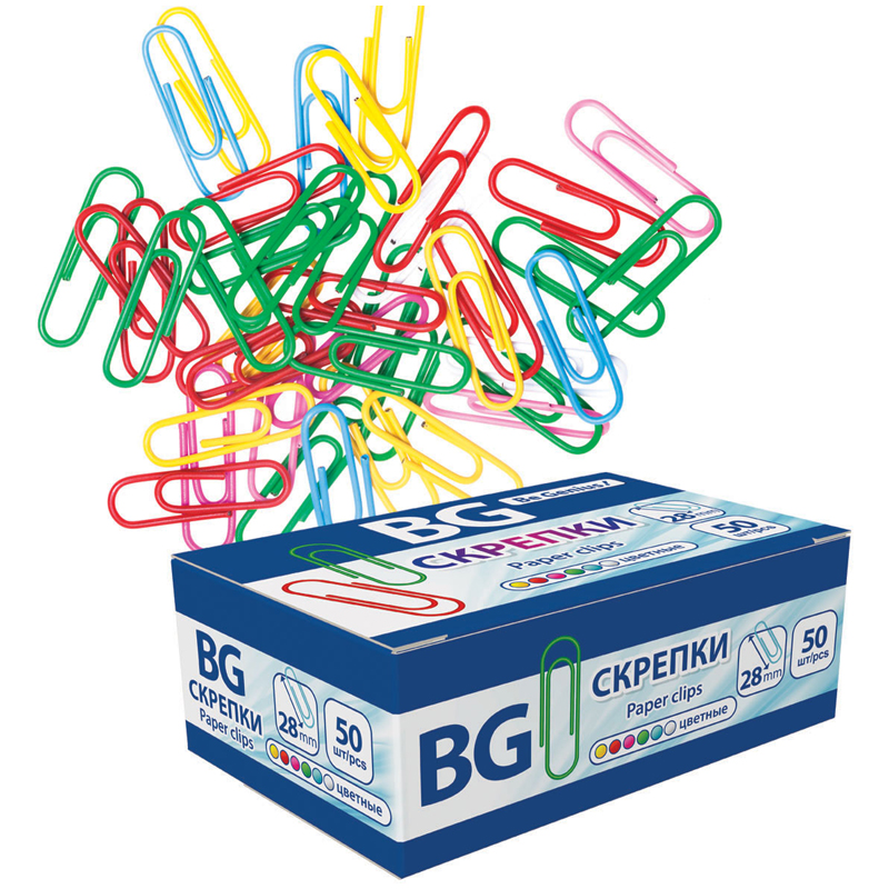 Скрепки 28мм, BG, 50шт., виниловые цветные, картонная упаковка