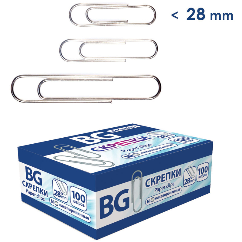 Скрепки 28мм, BG, 100шт., никелированные, картонная упаковка