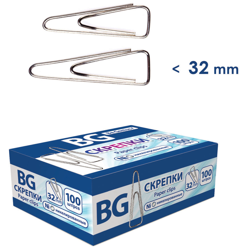 Скрепки 32мм, BG, 100шт., никелированные треугольные, картонная упаковка