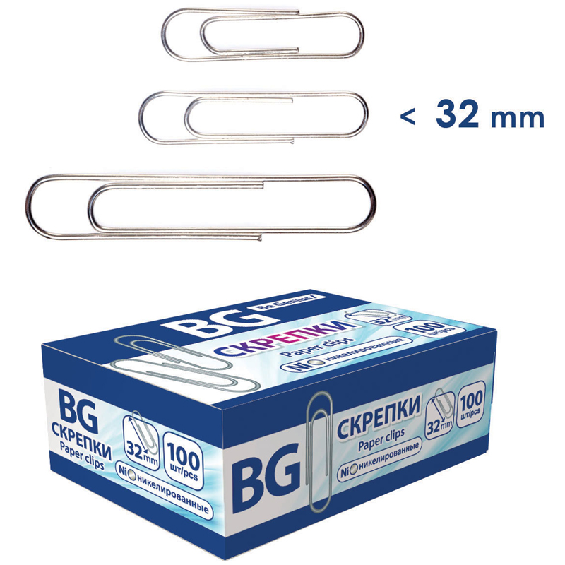 Скрепки 32мм, BG, 100шт., никелированные, картонная упаковка