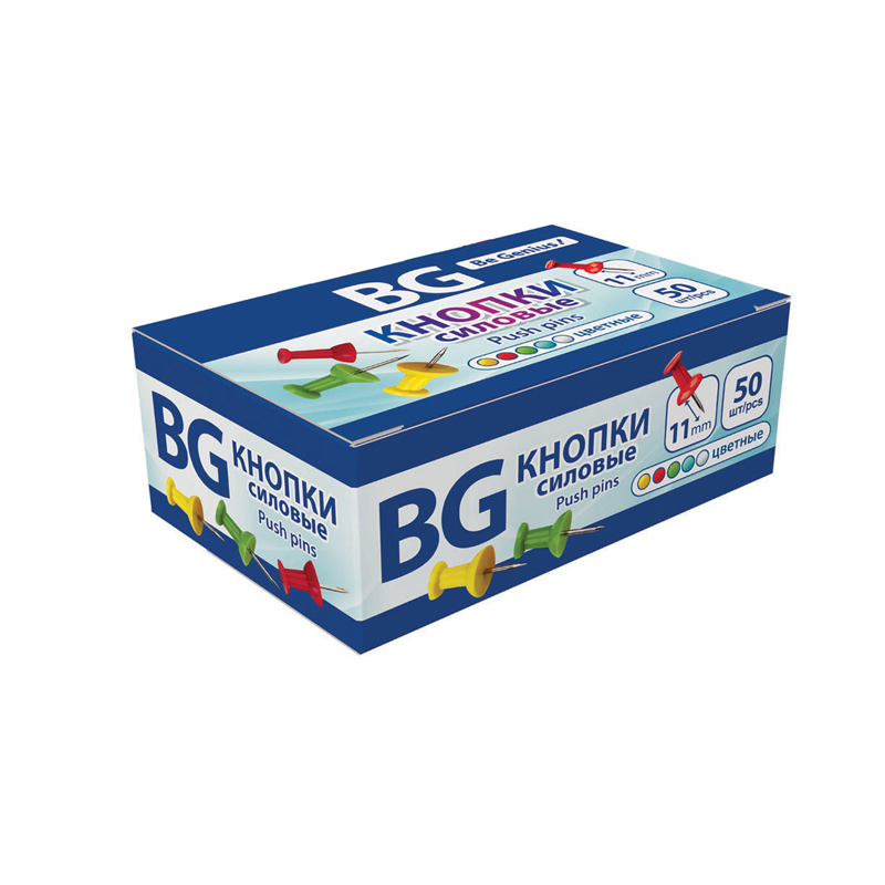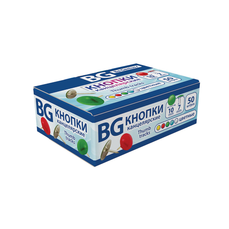 Кнопки канцелярские/гвоздики BG, цветные, 10мм, 50шт., карт. упак.