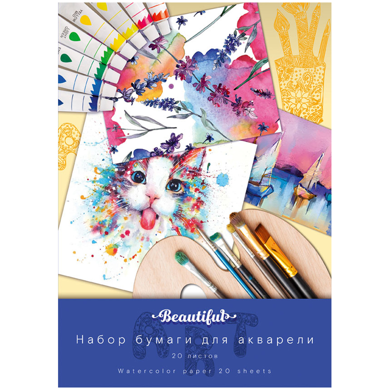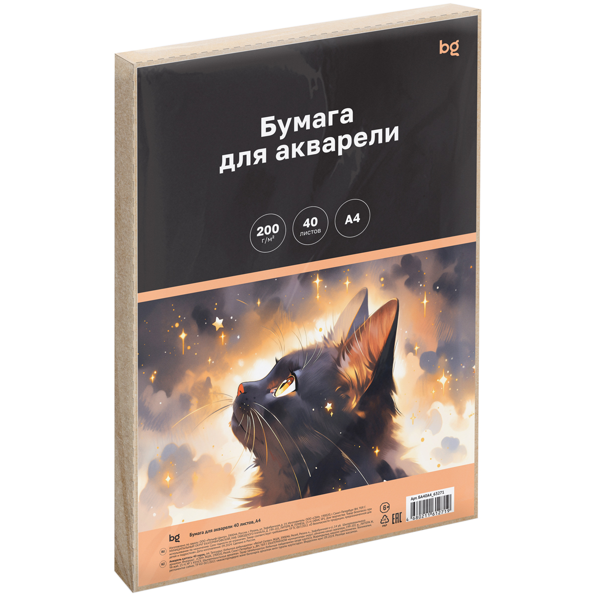 Бумага для акварели 40л. А4, BG "Акварельный кот", среднее зерно, 200 г/м2, в КОРОБЕ