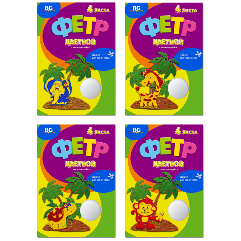 Фетр цветной самоклеящийся А4, BG "Чунга-Чанга", 4л., 4цв., папка