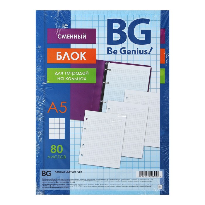 Сменный блок для тетрадей на кольцах А5, 80 листов в клетку, белый, 60 г/м2