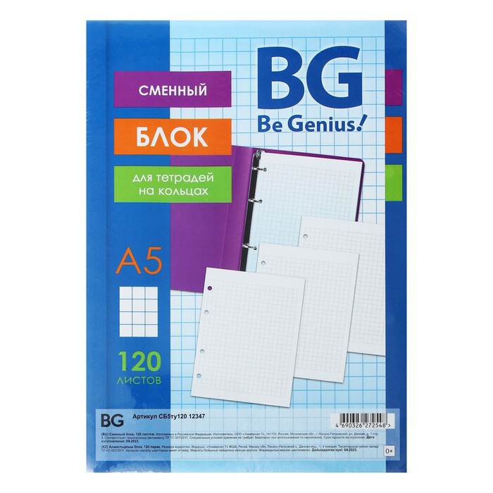 Сменный блок для тетрадей на кольцах А5, 120 листов в клетку, белый, 60 г/м2