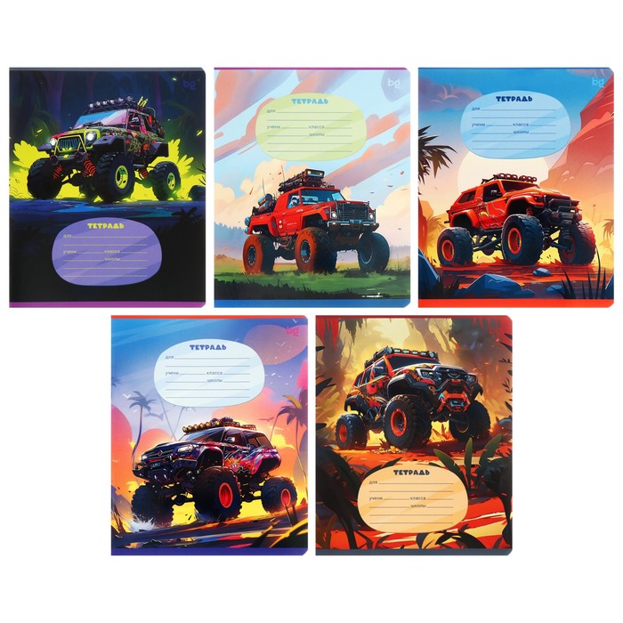 Тетрадь 12 листов в крупную клетку Оff-road, обложка мелованный картон, выборочный лак, МИКС