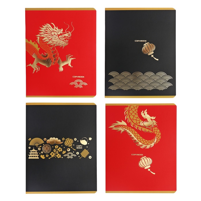 Тетрадь 80 листов в клетку на скрепке Dragon, обложка мелованный картон, матовая лаимнация, тиснение фольгой, МИКС
