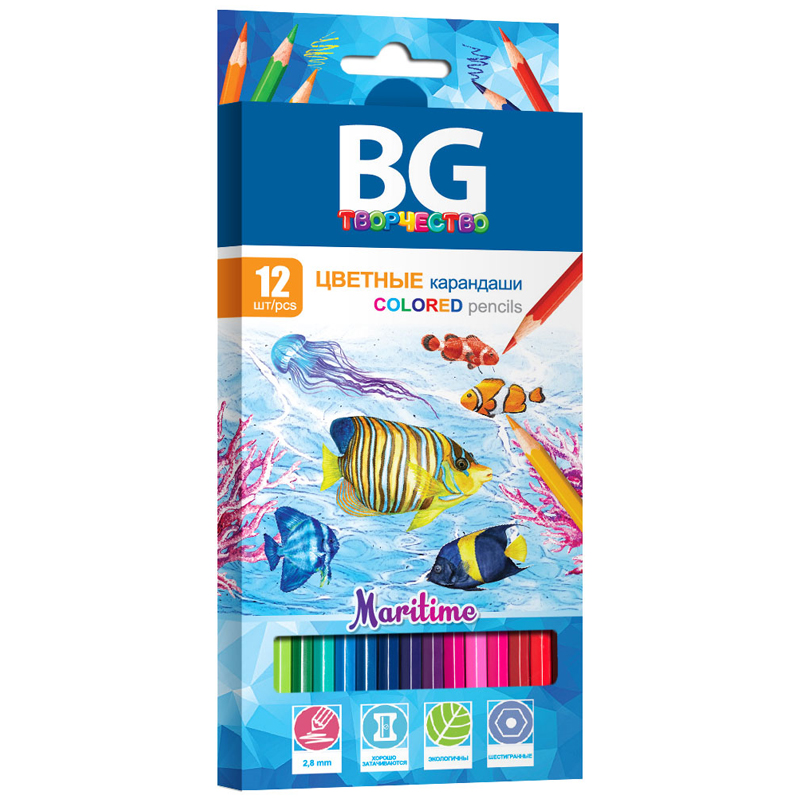 Карандаши цветные BG "Maritime", 12цв., шестигранные, пластиковые, 2,8мм, европодвес