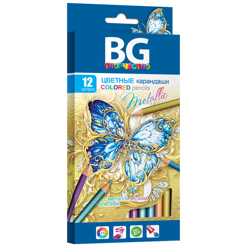 Карандаши цветные BG "Metallic", 12цв., круглые, 3,0мм, заточенные, европодвес