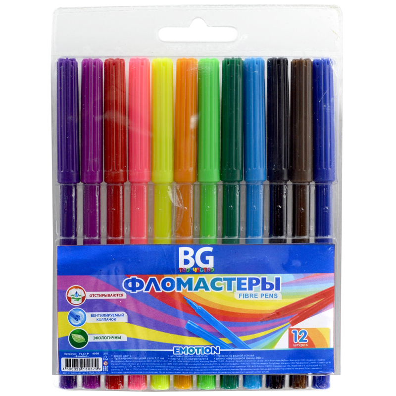 Фломастеры BG "Emotion" 12цв., 2,0мм, ПВХ, европодвес