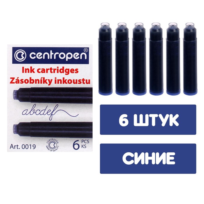 Картриджи для перьевых ручек Centropen 0019/06, 6 штук, чернила синие