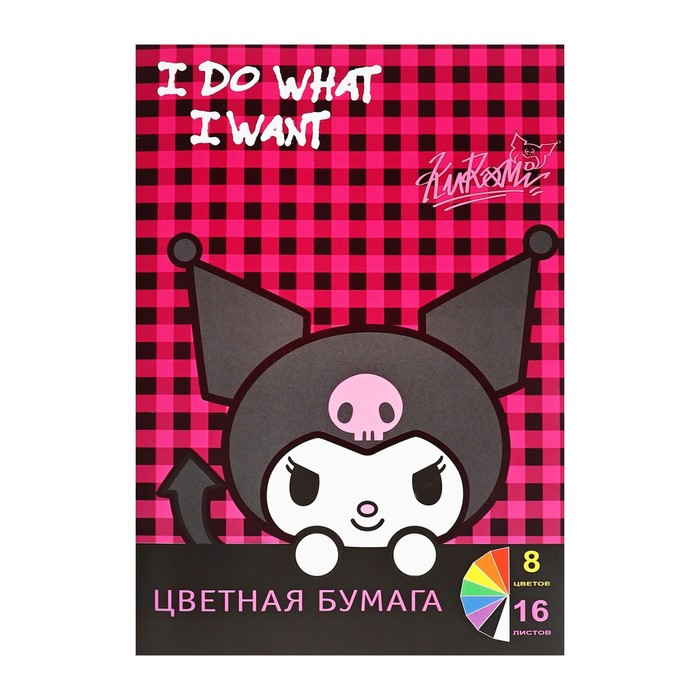 Бумага цветная А4, 16 листов 8 цветов Kuromi, немелованная газетная, односторонняя, на скрепке, 48 г/м²